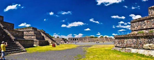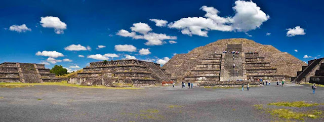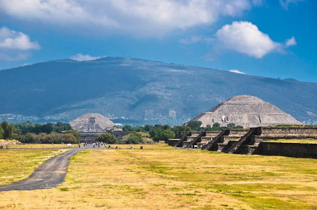 在墨西哥存留的大部分是玛雅金字塔的遗迹,而日月金字塔则是托尔蒂克人遗弃的一座古城: 特奥蒂瓦坎(Teotihuacan),它座落在波波卡特佩尔火山和依斯塔西瓦特尔火山山坡谷底之间,“特奥蒂瓦坎”在印第安语中的意思是“诸神之都”。导游把我们带到金字塔的外围从远处认识金字塔的全貌,正前方是月亮金字塔,右边的是世界第三大的太阳金字塔。
